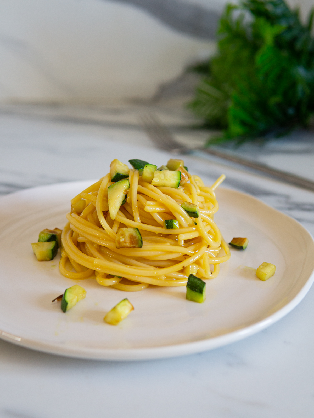 - Completare la carbonara: Spegni il fuoco, aggiungi gli spaghetti in padella con le zucchine, unisci la salsa e un po’ di acqua di cottura.