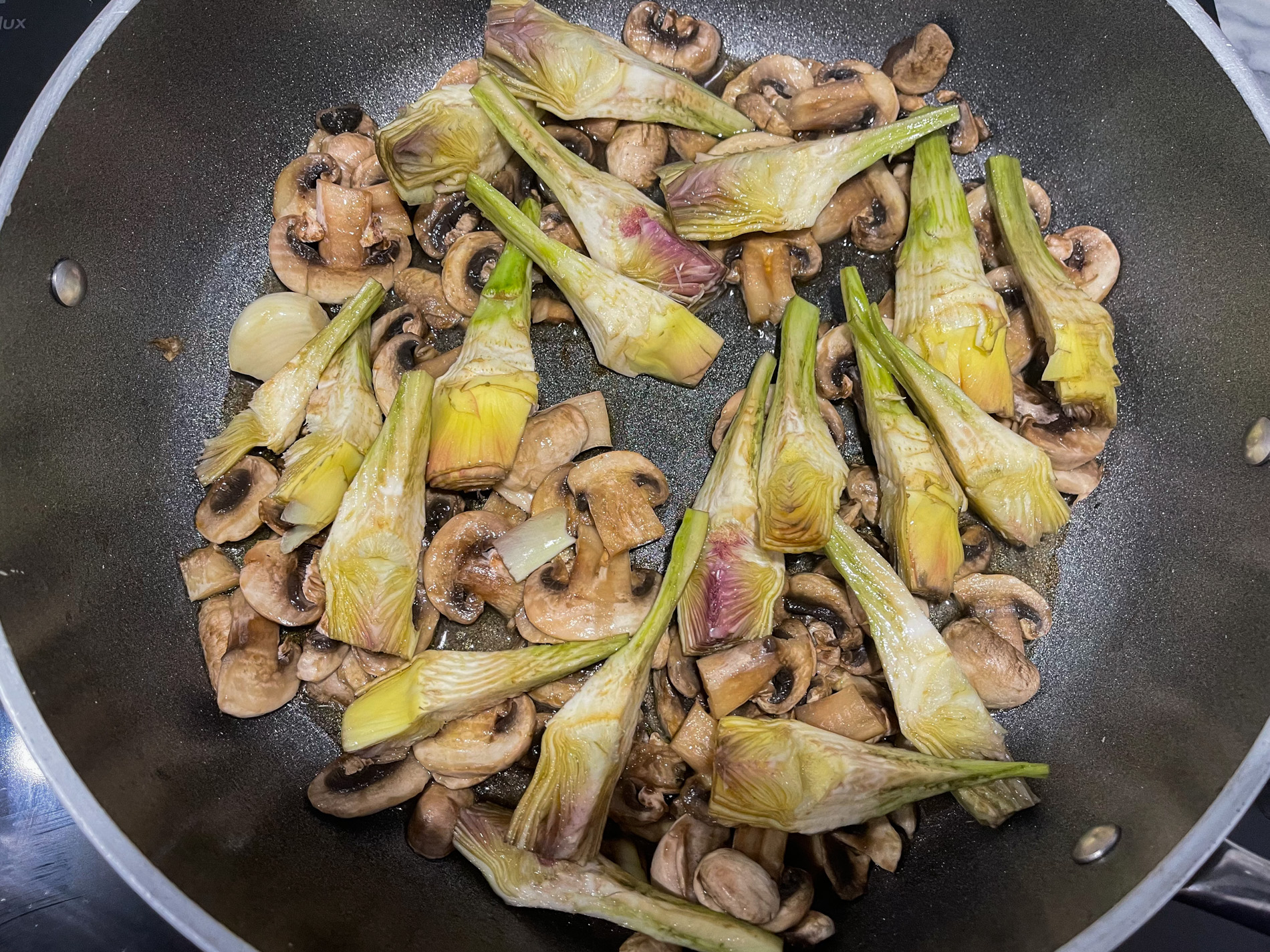 - Unisci i carciofi, i funghi (ricordati di eliminare l’aglio) e una manciata di prezzemolo tritato. Mescola.