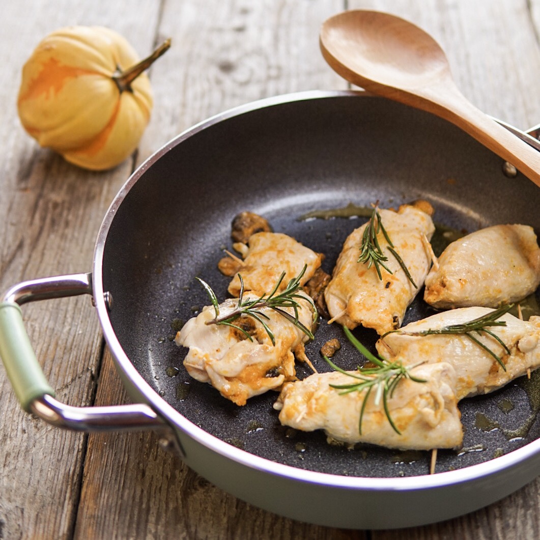 - Disponete gli involtini in una casseruola con un cucchiaio d’olio e del rosmarino. Cuocete gli involtini per 10 min girando di tanto in tanto.