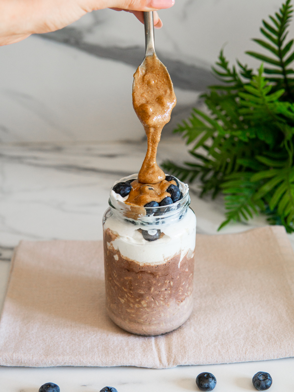 Overnight oat con yogurt, mirtilli e burro d’arachidi