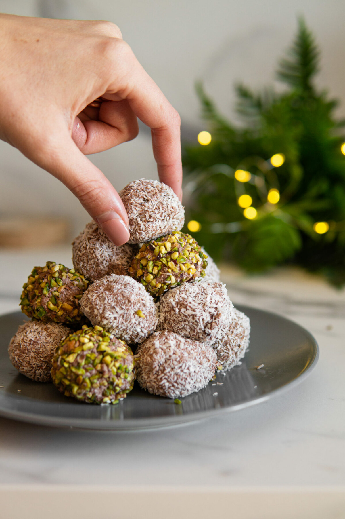 - Crea delle palline e impanale nel cocco rapè oppure nella granella di pistacchio o nocciole.