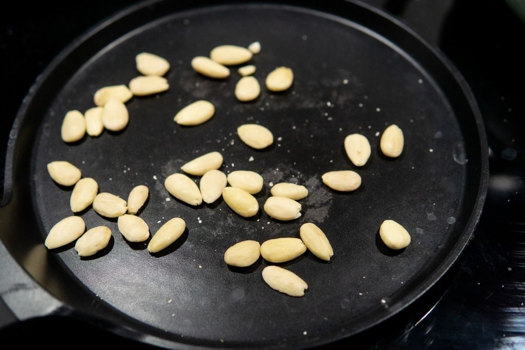 - Trasferisci le mandorle pelate in una padella ben calda e lascia tostare 5 min girandole di tanto in tanto, in modo da evitare che brucino.